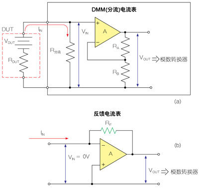 圖2:分流電流表電路(a)與反饋電流表電路(b)。