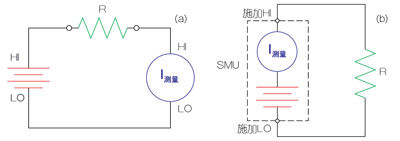 SMU還適于測量高電阻。在SMU內(nèi)部,電流表和電壓源采用串聯(lián)連接(見圖3b)。未知電阻連接在SMU的HI施加端子和LO施加端子之間。