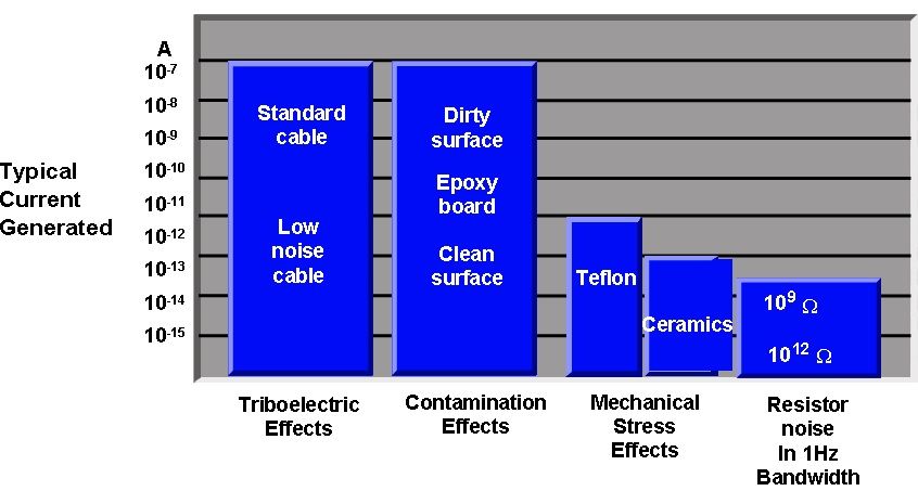 當(dāng)絕緣端子和互連硬件使用某種晶體材料、而這些材料又受到機(jī)械應(yīng)力時就會產(chǎn)生壓電電流。為了盡量減小這些壓電效應(yīng),建議盡量消除來自絕緣體的機(jī)械應(yīng)力,并選擇具有最小壓電效應(yīng)和存儲電荷的絕緣材料。