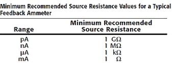 待測設(shè)備的源電阻和源電容都會影響反饋式電流計的噪聲性能。當(dāng)源電阻減小時,電流計的噪聲增益會增加。表1列出了針對不同量程的反饋電流計的典型源電阻推薦值,但還是建議查閱特定電流計的參考手冊獲得推薦值。