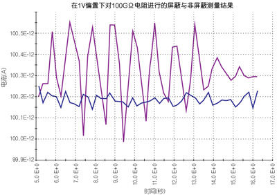 圖5:對100GΩ電阻的非屏蔽與屏蔽電流測量結(jié)果表明,非屏蔽系統(tǒng)中噪聲有顯著的增加。